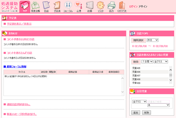 予定表、各お知らせ情報(申し送り、メッセージ、フォーラム、日誌コメント)、注目児童情報、読まれた回数の多い日誌TOP5、日誌を書き込まれていない児童情報を掲載。
