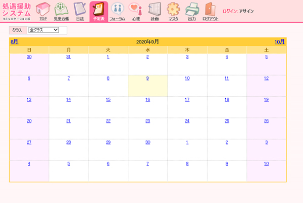児童のその日の様子などを日誌として書き込む機能です。クラス毎に複数児童を指定する事が可能。日付範囲などの条件指定により日誌の検索が可能。