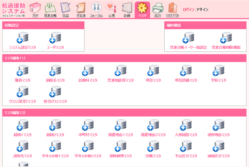 システム設定マスタ、ユーザマスタ、病院名/診療科マスタ、児童相談所マスタ、学校マスタ、居室マスタといった業務に必要なマスタ情報を登録・管理できる機能。