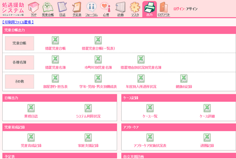 措置児童台帳、措置児童名簿、市町村別児童名簿、部屋割り、担当表、年度別入所退所状況、健康の記録、アフターケア実施状況表といった各種帳表をExcelシートにて出力が可能。